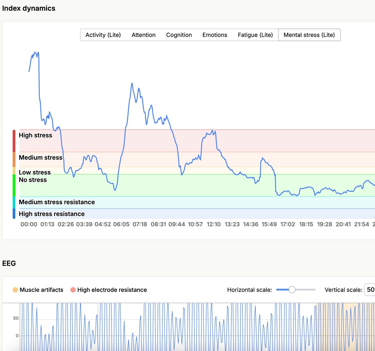 EEG (Neurodive) наглядно показывает тренды внимания, стресса, ментальной нагрузки и нейропластичности до/после практик.